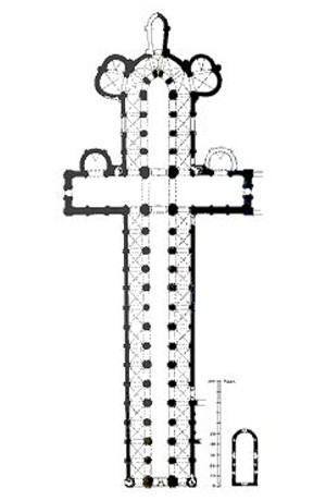 The great range of designs among medieval churches can be attributed partly to size. The twelfth-century parish church of Little Tey, Essex, England, was only 57 feet long and had a simple floor plan (lower right corner). The floor plan of Norwich Cathedral, also twelfth century, shows adaptations—transept, chapels—required for the 450-foot-long building. The need for light and support dictated complex cathedral layouts.