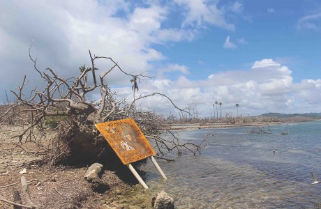 A glimpse of the destruction caused by Hurricane Maria. One of the battered signs warning against unauthorized entry to the field site now leans against dead vegetation as its normal location has been underwater since the storm in September 2017.