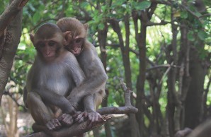 Two juvenile rhesus macaques cuddle in the lush and abundant vegetation before Hurricane Maria.