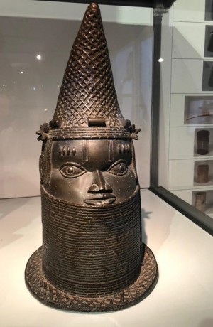 The displays above and below of Benin bronzes are some of the ninety-four bronzes currently at the Rautenstrauch-Joest Museum in Cologne, Germany. They were among the 3,500-4,000 bronzes that were looted in 1897 by British troops from the royal palace in Benin City before the city was set on fire. In an agreement between the governments of Germany and Nigeria, many of the 1,100 bronzes originally bought by Germany are beginning to be returned to Nigeria.
