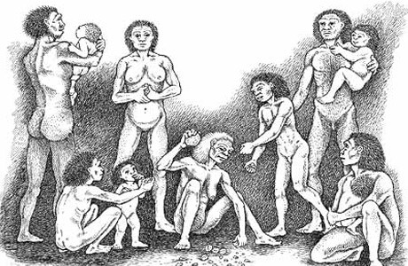 Artist’s rendering of Homo erectus, ancestral humans who lived in Africa in small groups as early as 1.8 million years ago: The woman in the center is cracking open nuts, while parents and other group members (so-called alloparents) help take care of infants. Shared care coevolved with empathetic awareness; mothers and infants benefited from intuiting who would help and who would hurt.