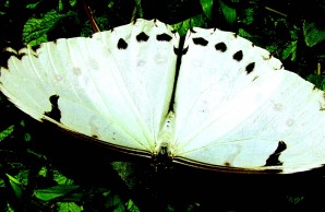 Suddenly I spotted what ap­peared to be a snow-white bird gliding above the forest canopy. But no, the specter was instead an enormous butterfly. Based on what I remembered reading, this had to be the “white morpho” (Morpho polyphemus)—an unusual member of a group of large tropical but­terflies that usually sport metallic blue wings. From my vantage point along the road, I now could see that the butterfly was particularly at­tracted to the emergents, trees that rose above the canopy. The insect would circle—perhaps searching for its host plant or for a source of nectar or nutritious sap—then move on, flapping its wings with deep, deliberate strokes. I stood there, hop­ing that when it crossed the road it would descend to ground level.