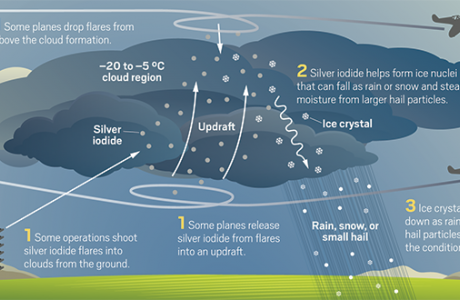 Weather modification firms launch silver iodide flares from planes or from the ground into cloud formations to try to increase rainfall or mitigate hailstorms.