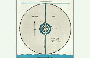 The remainder of the dialogue has to do with the natural sciences. In the next dialogue, Critias, there is more about Atlantis. When the gods divided up the earth, Poseidón received Atlantis. He begat ten sons, and divided the land amongst them. They were to rule it as a confederacy of kings, and the eldest, Atlas, was to be head king. The land was marvelously productive, with minerals and elephants. The descendants of these kings built the city of Atlantis. It was circular, about fifteen miles in diameter. Through the middle ran a canal connecting the sea with a great rectangular irrigated plain on the far side. The plain was about 230 by 340 miles. In the center of the city was the citadel, also circular, about three miles in diameter, comprising concentric rings of land and water. The land rings were interconnected by bridges, and the water rings by tunnels large enough for ships. The palaces and temples were lavishly decorated with gold, silver, brass, ivory, and a mysterious oreichalkón, “mountain copper,” which “glowed like fire.” There is no word of explosives, searchlights, or airplanes, with which imaginative modern Atlantists have credited the Atlanteans. The only ship mentioned is the trireme (triéré), and except for oreichalkón, Plato described no technics not known to his own time.