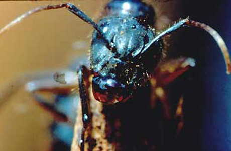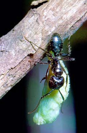 Not long after these specialized organs become active in a newly molted larva, the caterpillar attracts its associates, ants of the species Camponotus abdominalis, commonly referred to as wood ants or carpenter ants because they nest in old logs, fence posts, and even house beams. This species can be found throughout most of tropical Mexico and Central America. At night these ants scour the countryside (and villagers’ kitchens) looking for, above all else, sweet things to eat. Needless to say, the Anatole caterpillars with their honeydew glands fill the bill.
