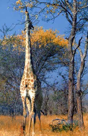 During my three years in Kruger National Park, I spent my days tracking the movements of my study animals and recording their choices of habitats and food. Many interesting results emerged as my work proceeded, but perhaps the most remarkable was the relationship between giraffes and the knobthorn acacias (Acacia nigrescens), common trees of the dry plains and ridges. Toward the end of the dry season, giraffes are lured away from the riverine vegetation by the knobthorn flowers. Borne in clusters on the ends of branches, knobthorn blossoms are easily cropped by giraffes as they roam from tree to tree, and provide them with up to a quarter of their food during August and September, when the trees are in full bloom. Other browsers lack the giraffes’ height advantage and are unable to reach flowers on most knobthorn trees, although I often saw impalas scavenging dead flowers that had fallen to the ground.