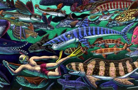 In Swimming with the Sharks (detail), the artist portrays himself among living and extinct cartilaginous fish known from various localities around the world.